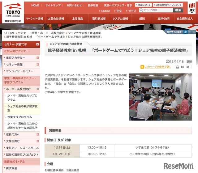 東京証券取引所の冬休みプログラム「シェア先生の親子経済教室」が、東京と札幌で開催される。小学4年生から中学生の子どもとその保護者が対象で、参加申込みは12月4日(木)から開始。