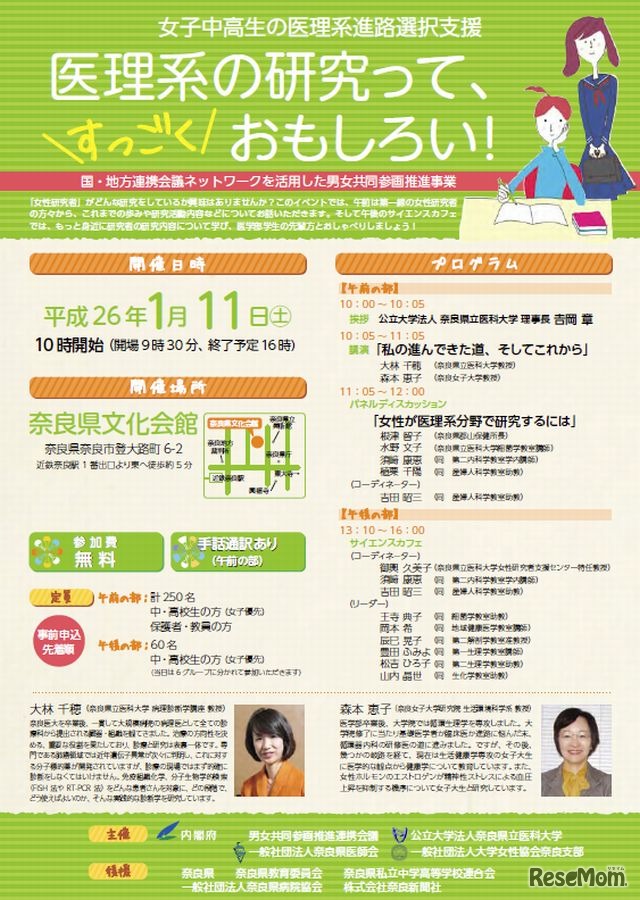 内閣府は、女子中高生の医理系進路選択支援イベント「医理系の研究って、すっごくおもしろい!」を、2014年1月11日に奈良県文化会館にて開催する。対象は、女子中高生およびその保護者。参加費無料。