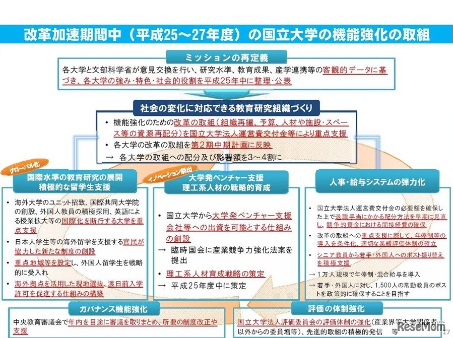 文部科学省は国立大学改革プランを発表した。第3期中期目標期間(2016年度から2021年度)には各大学の特色を生かした機能強化を推進、今後10年間で世界大学ランキングトップ100に10校以上のランクインを目指す。