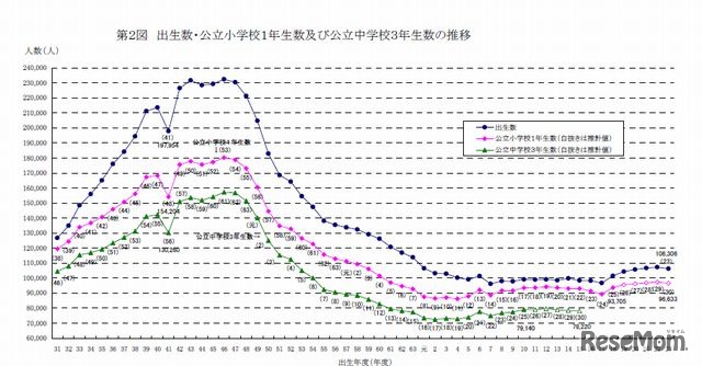 出生数、公立小1年数、公立中3年数の推移