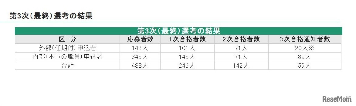 大阪市教育委員会は2014年度の市立小学校・中学校・高等学校の校長公募の最終合格者数を発表した。これによると民間採用が当初の予定を大きく下回り20人の採用となり、内部と合わせて59人となった。