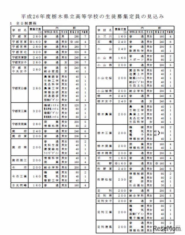 栃木県教職員課は9月、平成26年度栃木県立学校の募集定員の見込みについて発表した。これによると、募集定員は全日制で前年度比40人減の12,515人、特別支援学校高等部および高等部専攻科で前年度比22人減の495人募集する。