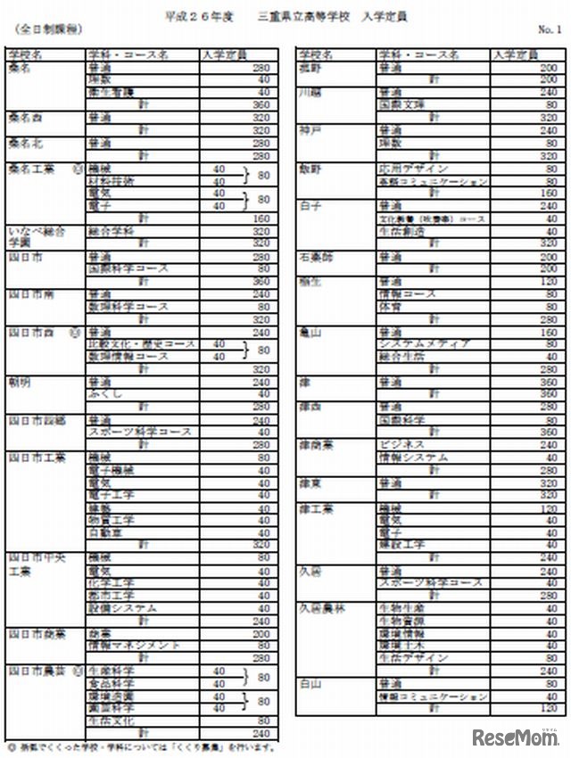 三重県教育委員会は、平成26年度三重県立高校の募集定員について発表した。募集定員は全日制で前年度比120人増の13,065人となる。