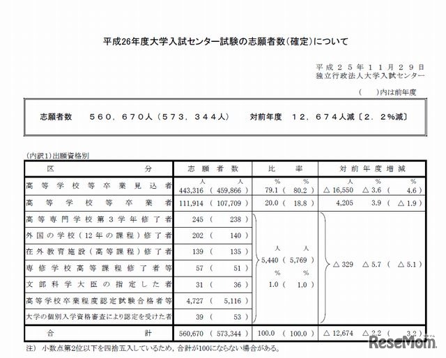大学入試センターは11月29日、平成26(2014)年度大学入試センター試験の確定志願者数を発表した。志願者数は、現役志願者の減少により、前年度より1万2,674人減の56万670人。センター試験に参加する大学は、過去最高となる843大学に上った。