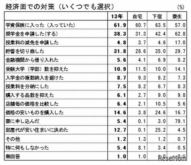 受験から大学入学までにかかる費用は増加傾向にあり、予算以上の出費に奨学金申請や貯蓄切り崩しで対応している保護者が多い実態が、全国大学生活協同組合連合会が実施した「2013年度保護者に聞く新入生調査」の結果から明らかになった。