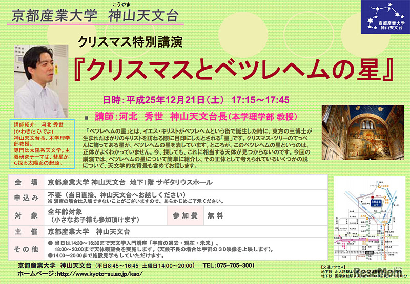 京都産業大学神山天文台は12月21日、天文学入門講座「宇宙の過去・現在・未来」を開催。また同日、クリスマスツリーに飾られている「ベツレヘムの星」について、河北英世 神山天文台長によるクリスマス特別講演も実施する。