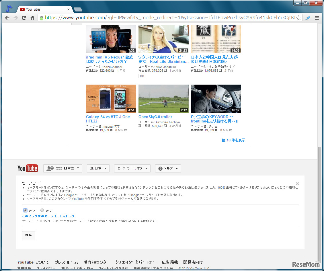 YouTubeセーフモードは、各ページの最下部、フッターで設定が可能だ