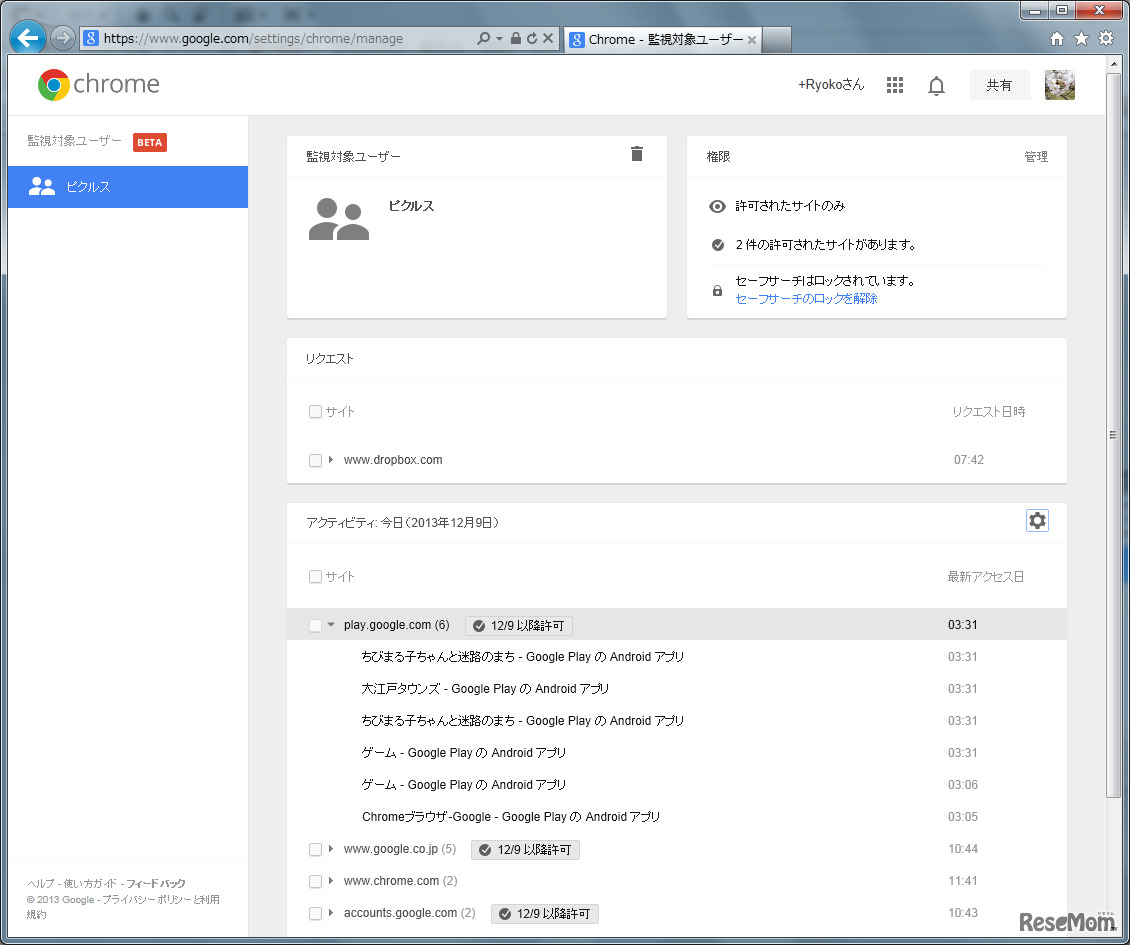 監視対象ユーザーの閲覧履歴の確認や設定をするダッシュボード