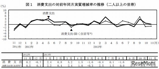 総務省は12月27日、2人以上の世帯の家計調査報告について、11月分の速報結果を公表した。消費支出は、1世帯あたり279,546円で前年同月比実質0.2%の増加、前月比実質0.3%の減少。このうち教育費は、8,121円と2か月連続の実質減少で、前年同月比実質13.6%の減少となった。