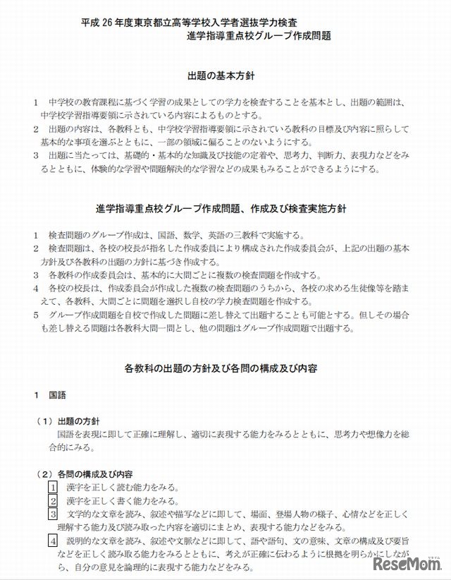 平成26年度東京都立高校入試より、15校がグループ作成問題を導入する。出題方針やサンプル問題・解答が各校のホームページに掲載されている。第一次募集・分割前期募集の学力検査は2月24日に実施される。
