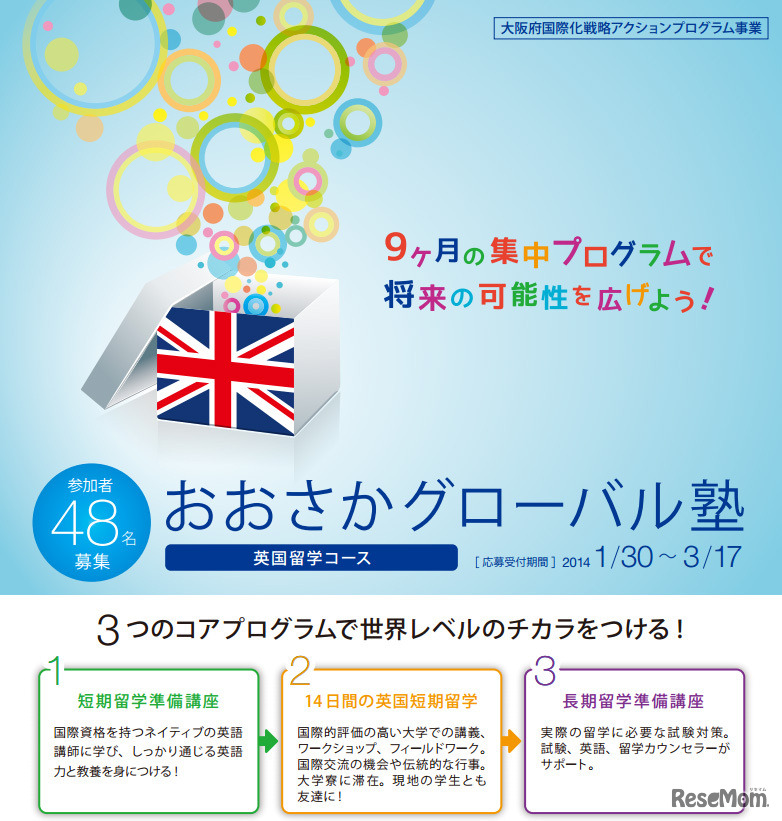 大阪府国際化戦略実行委員会は、大阪の高校生の海外留学を支援する「おおさかグローバル塾」平成26年度塾生(第3期生)の募集を1月30日より開始した。2週間の短期留学および年間50時間以上の講座がセットとなっている。