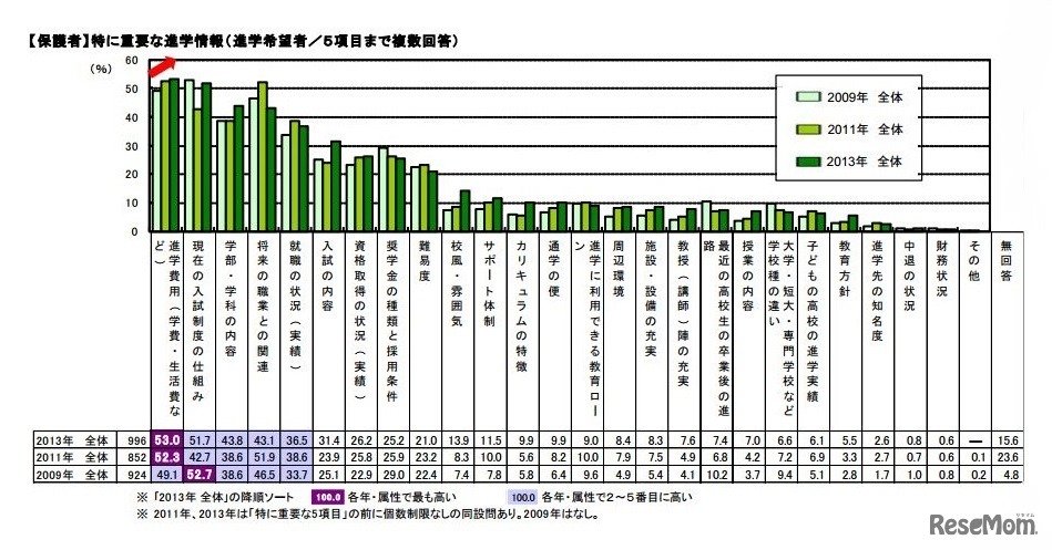 全国高等学校PTA連合会とリクルートマーケティングパートナーズが公開した「第6回高校生と保護者の進路に関する意識調査2013」によると、進学にあたり保護者が重要だと考える情報は「進学費用」で、前々回調査から2回連続の増加となった。