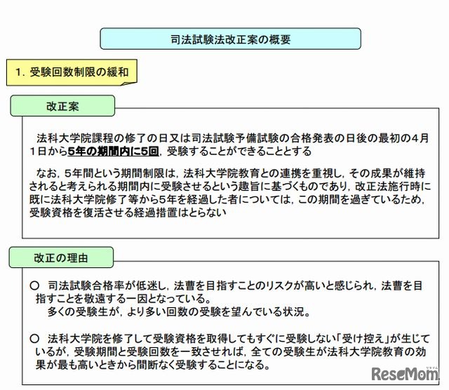 政府は2月4日、司法試験の受験回数制限を緩和する「司法試験法改正案」を閣議決定した。司法試験の受験回数である5年間に3回という制限を廃止し、受験資格を取得してから5年間は毎回受験できるよう、今国会での成立を目指す。
