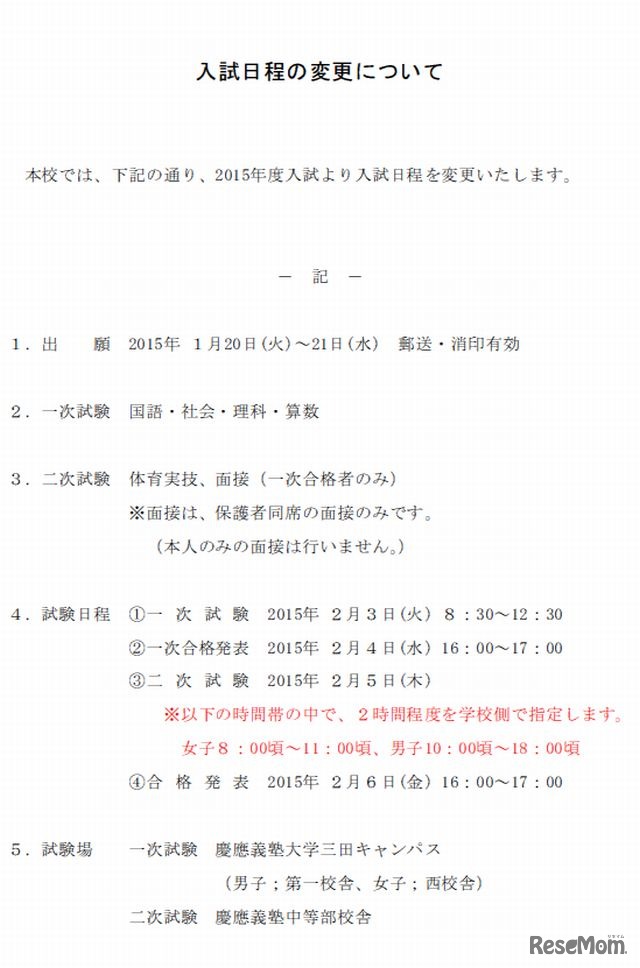 慶應義塾中等部は2月28日、平成27(2015)年度の入試日程変更について発表した。一次試験は2015年2月3日(火)、二次試験は2月5日(木)に行う。