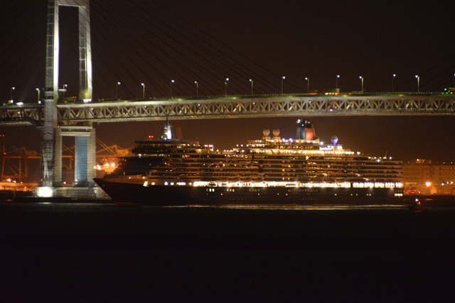 16日深夜、ワールドクルーズ中の大型外国客船「クイーン・エリザベス号」が横浜港大さん橋国際客船ターミナルに入港した。