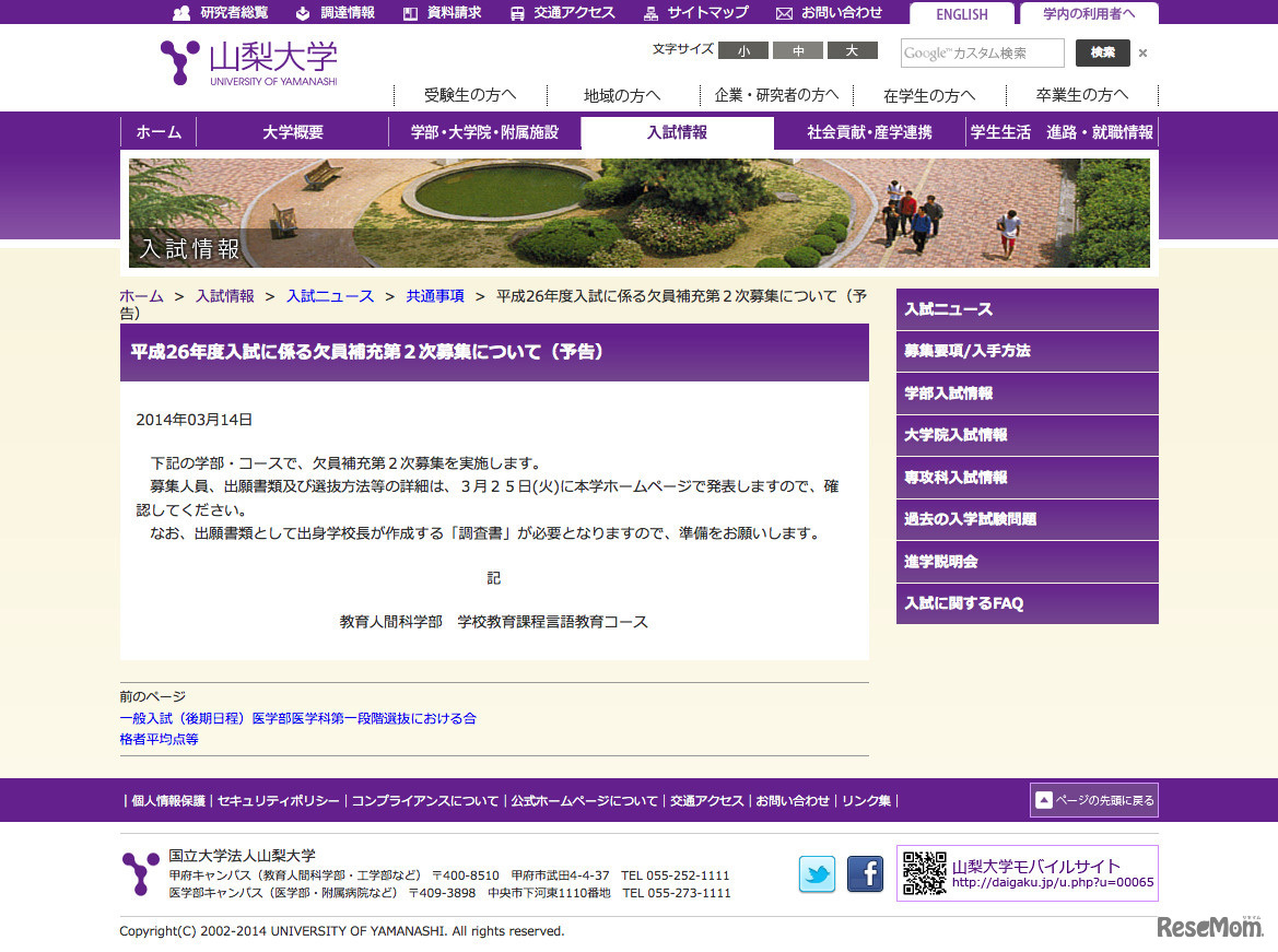 山梨大学:平成26年度入試に係る欠員補充第2次募集について(予告)