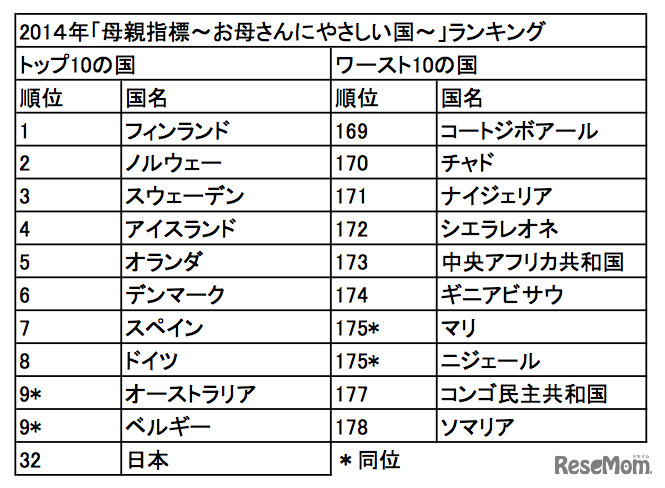 お母さんにやさしい国ランキング2014は、1位「フィンランド」、2位「ノルウェー」、3位「スウェーデン」で北欧諸国がトップ3を占め、日本は178か国中32位であったことが、セーブ・ザ・チルドレンが5月6日に発表した「母の日レポート」より明らかになった。