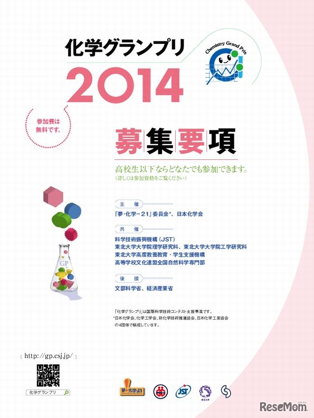 国際科学オリンピックの日本代表選考にあたる「化学グランプリ2014」「日本生物学オリンピック2014」「物理チャレンジ2014」「第25回日本数学オリンピック」の4科目の参加者を募集している。