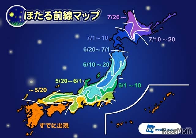 ウェザーニューズは5月15日、ほたるの出現傾向を発表。西日本から東日本では5月中旬から6月上旬が出現ピークになり、東京でも5月23日頃から飛び始めると予想している。