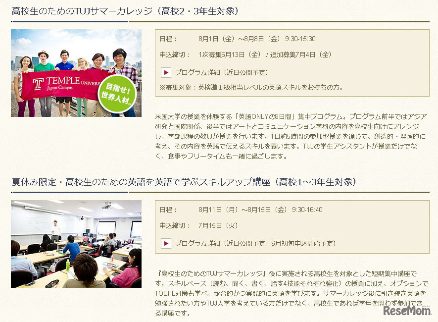 テンプル大学ジャパンキャンパス(TUJ)は、小・中・高校生を対象とした英語学習の夏期集中プログラムを各種実施する。日本にいながらにしてアメリカのスタイルの授業を体験できる。