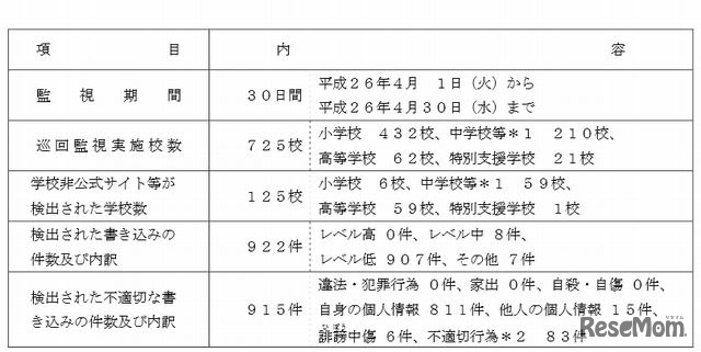 東京都教育委員会は5月21日、学校非公式サイト(学校裏サイト)などの平成26年4月の監視結果を公表した。不適切な書き込みの件数は、前月の1.6倍となる915件。「自身の個人情報の公開」がもっとも多く、811件に上った。