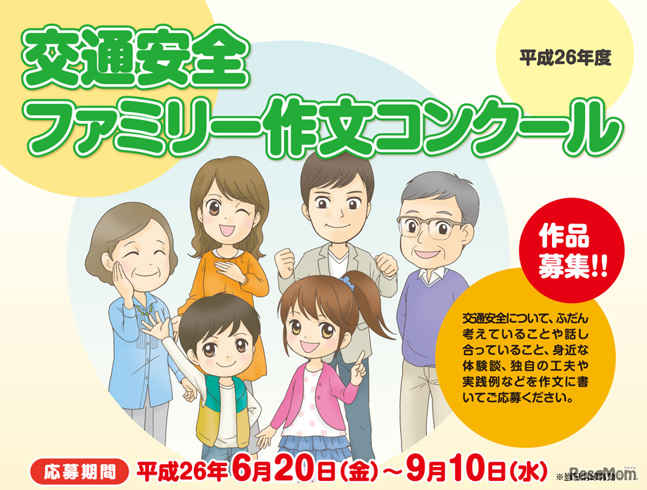 内閣府と全日本交通安全協会、三井住友海上福祉財団、日本交通安全教育普及協会は、「2014年度 交通安全ファミリー作文コンクール」を開催。6月20日から9月10日まで作品を募集する。
