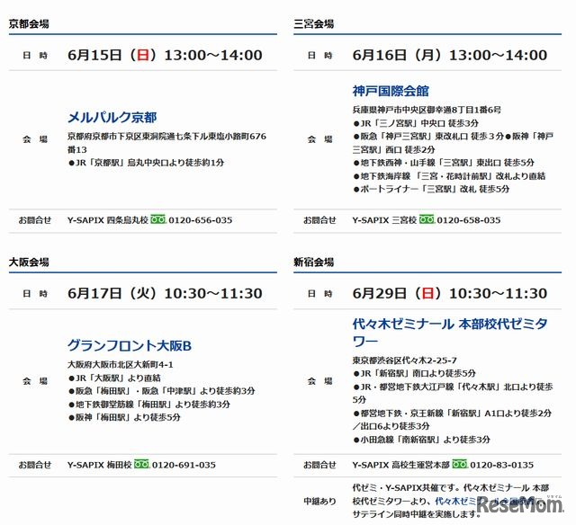 難関大現役合格を目指す進学塾のY-SAPIXは6月、「東大・京大最新入試動向ガイダンス2014」を関東や関西で開催する。東大や京大を目指す高校生や小中学生、保護者を対象に両大の入試制度や教育システム、学習法アドバイスなどを解説する。
