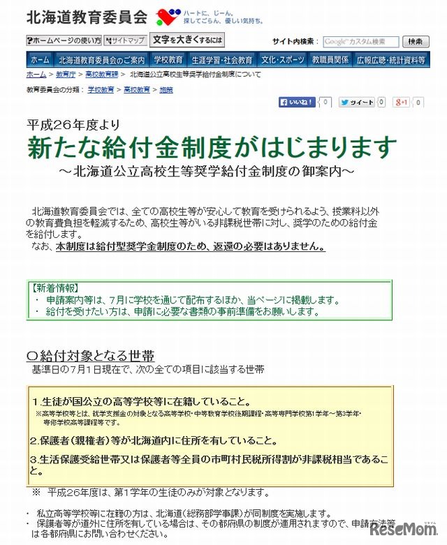 教育費負担の大きい低所得者世帯に対して高校生等の就学を支援する「高校生等奨学給付金」制度が平成26年度より始まる。国公私立や世帯構成に応じて年間3万2,300円から13万8,000円程度給付される。制度の詳細は都道府県によって異なる。