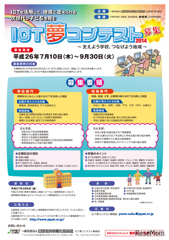 日本教育情報化振興会(JAPET&CEC)は、7月10日から9月30日まで「ICT夢コンテスト」を開催。学校部門と地域部門の2部門を設定し、ICTを活用した実践事例を募集する。