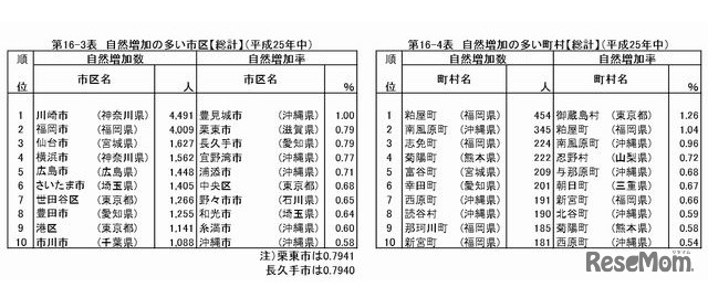 自然増加の多い市区・町村