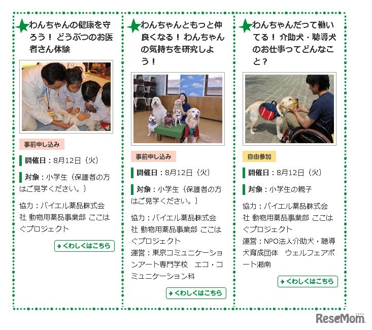 バイエル薬品動物用薬品事業部は、8月12日に「丸の内キッズジャンボリー2014」(東京国際フォーラム)で、「動物のお医者さん体験」や「介助犬・聴導犬デモンストレーション」などができる、小学生向け夏休みイベント「ここはぐサマースクール」を開催する。