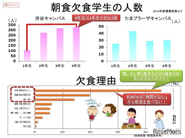 國學院大学は学生部企画として行っている朝食力プロジェクトの一環で4月に行った「朝食アンケート」の結果を発表した。朝食欠食は4年生が1年生の3.5倍と高く、欠食の理由の4割以上が「時間がない」となっていることがわかった。