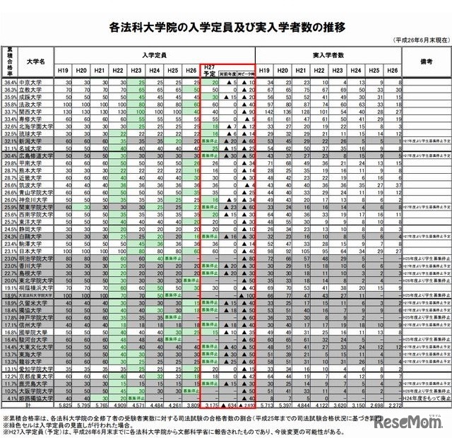 法科大学院の平成27年度の入学定員(予定)は、平成26年度より634人少ない3,175人と、過去最少を更新することが、文部科学省のまとめからわかった。廃止や募集停止校を含め、74校すべての法科大学院でピーク時より定員が削減されていた。