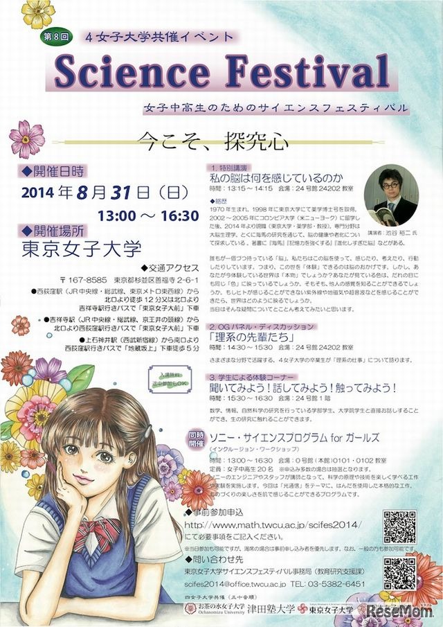 お茶の水女子大学など、女子大学4校による共催イベント「サイエンスフェスティバル」が8月31日、東京女子大学で開催される。女子中高生に向けて、パネル・ディスカッションや体験コーナーなどが行われ、「ソニー・サイエンスプログラムforガールズ」も同時開催される。