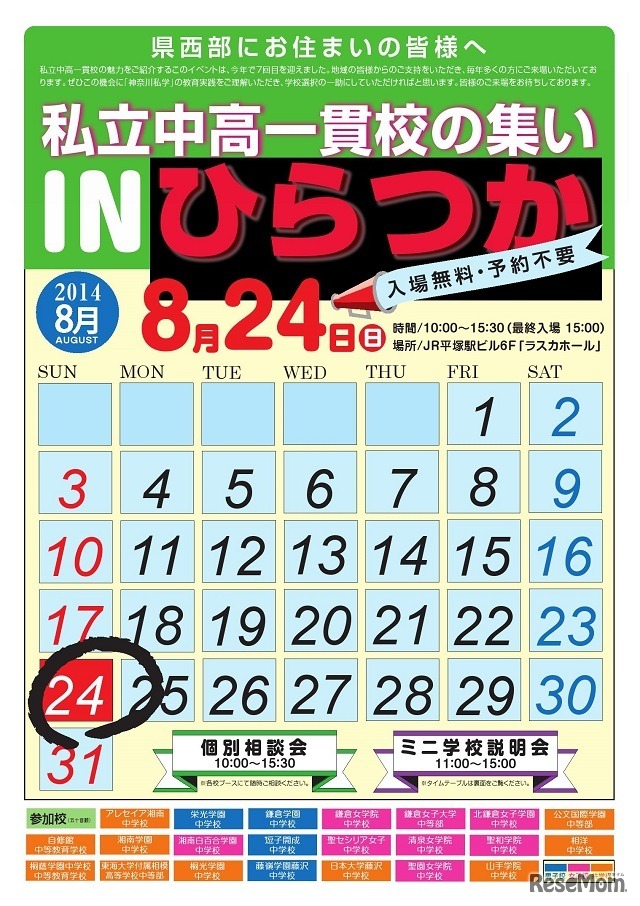 神奈川県内の私立中高一貫校の魅力を紹介するイベント「私立中高一貫校の集い inひらつか」が中学受験を考える小学生や保護者を対象に、8月24日に開催される。入場料は無料で事前予約は不要。