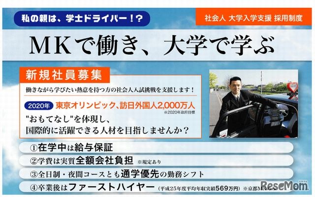 MKタクシーを全国8都市で展開するエムケイは7月23日、「社会人大学入学支援採用制度」を創設すると発表した。「働きながら学びたい」熱意のある人を正社員として採用し、給与保証や通学優先の勤務シフトなどでサポートする。