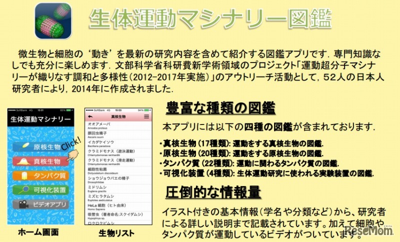 文部科学省の新学術領域プロジェクト「運動超分子マシナリーが織りなす調和と多様性」は、中高生向けのスマートフォン用アプリ「生体運動マシナリー図鑑」「同ビデオ・アーカイブ」を7月25日にリリースする。