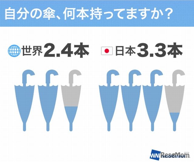 日本の傘の所持数は世界1位であることが、ウェザーニューズが7月24日に発表した「世界の傘事情調査」の結果からわかった。年間降水日数は35か国中13位だったが、傘の所持数は世界の平均2.4本に対し、日本は3.3本だった。