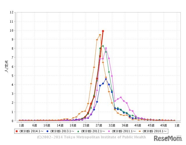 毎年夏に流行する感染症「ヘルパンギーナ」が首都圏で急増している。神奈川県、埼玉県では警報基準を超え流行期に入り、東京都では過去10年でもっとも多い発生状況となっている。千葉県は8週連続で増加しており、警報基準に近づいている。
