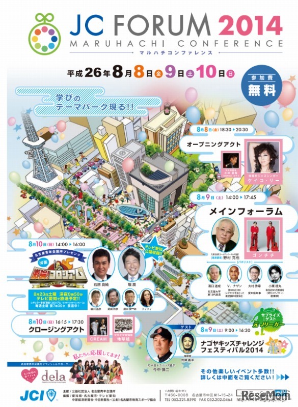 名古屋青年会議所(名古屋JC)は、8月8日から10日の3日間、愛知芸術文化センター、久屋大通公園周辺、名古屋市立東桜小学校で「JCフォーラム2014~マルハチコンファレンス~」を開催する。参加費無料。
