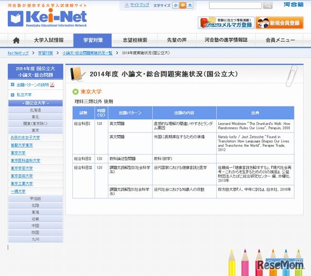 河合塾は7月28日、2014年度に国公私立大学の一般入試で出題された小論文・総合問題の実施状況を公表した。解答時間・出題パターン・出題内容・出典などの一覧表が、同塾の大学入試情報サイト「Kei-Net」より確認できる。