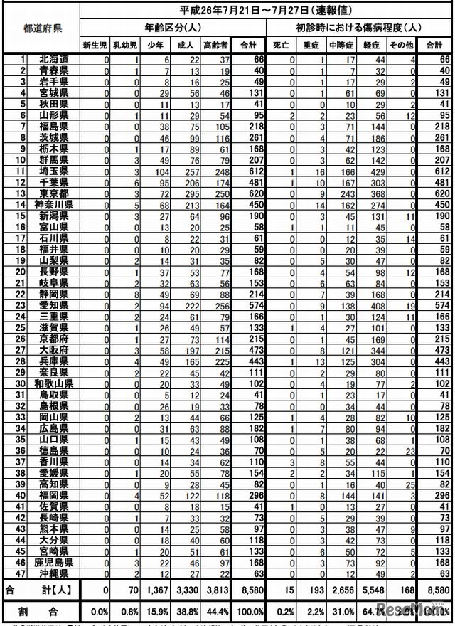 総務省消防庁によると、7月21日~27日の7日間に熱中症で緊急搬送された人は、速報値で8,580人に上る。年齢区分でみると、「高齢者」が44.4%ともっとも多く、都道府県別にみると、東京都、埼玉県、愛知県、大阪府などが多かった。