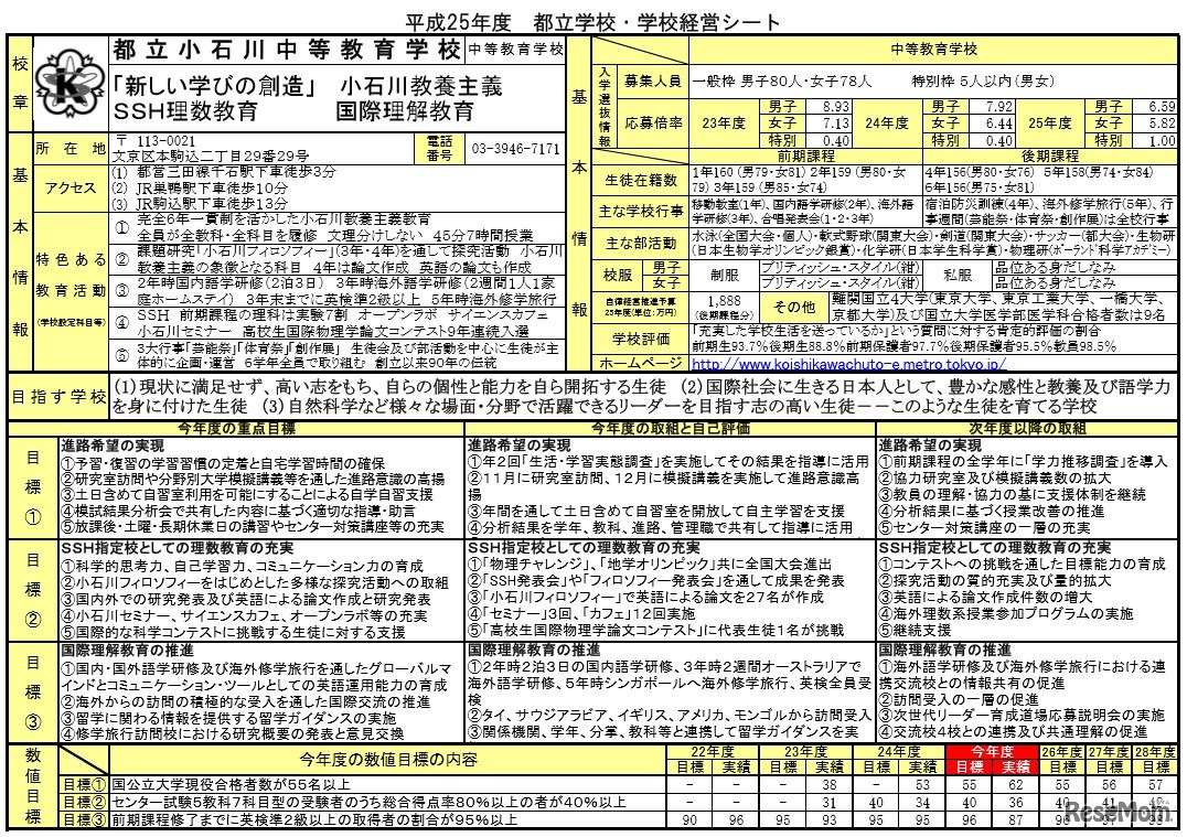 東京都教育委員会は9月22日、ホームページに掲載している「都立学校・学校経営シート」の情報を更新した。内容は、都立高校、中高一貫教育校、特別支援学校の特色ある教育活動や、進路・部活動の実績、学校満足度などが一覧でまとめられたもの。