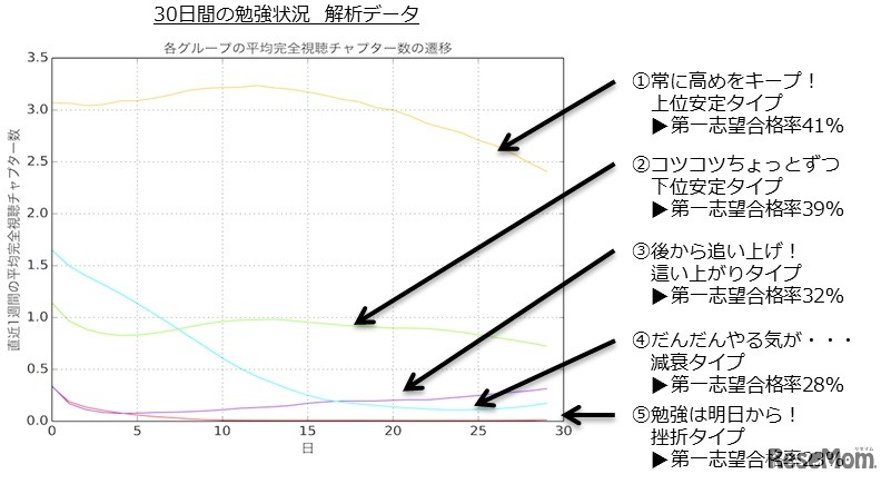 オンライン予備校「受験サプリ」利用者の1年半の計測データをもとに解析した結果、合格率の高い「上位安定タイプ」は24時以降勉強する割合が8%であるのに対し、合格率の低い「挫折タイプ」は24時以降に勉強をする割合が14%に上ることが明らかになった。