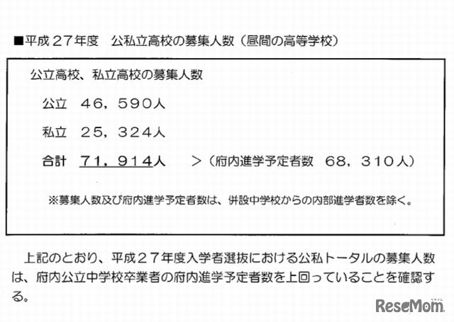 大阪府公私立高等学校連絡協議会は11月10日、平成27(2015)年度公立・私立高校の募集定員を決定した。全日制公立高校は前年度比490人減の46,590人、私立高校は前年度比460人減の25,324人の計71,914人募集する。