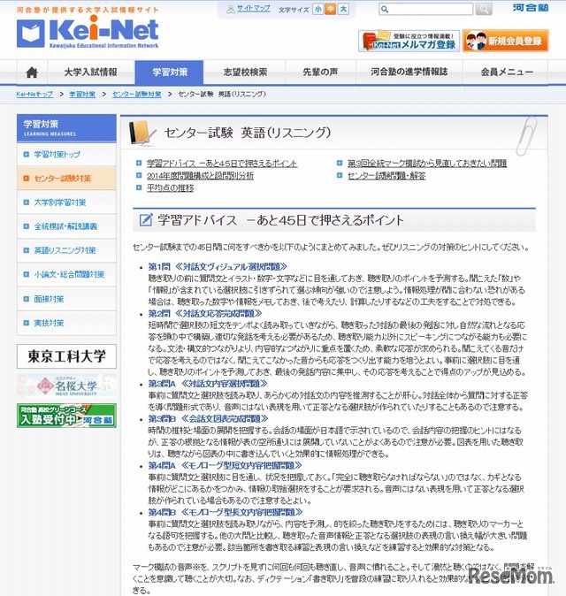 センター試験まであと50日を切った。河合塾が提供する大学入試情報サイト「Kei-Net」は11月27日、センター試験対策として「あと45日で押さえるポイント」を掲載。科目別に問題の傾向・学習指針を解説している。