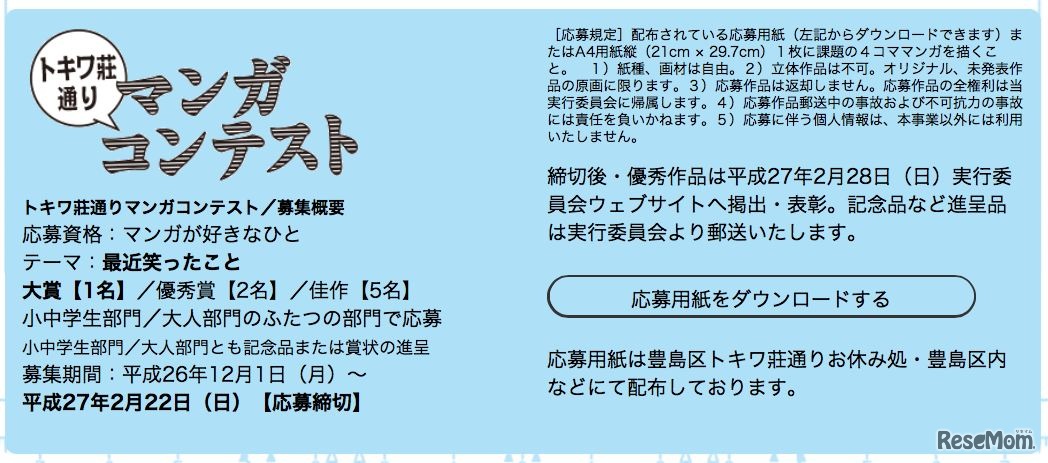 東京都は、12月14日(日)および2015年2月22日(日)、地域資源発掘型実証プログラム事業の一環として、マンガ家に憧れる小中学生を対象としたマンガ文化を活用したイベント「トキワ荘マンガでつながる『トキ(時)とワ(輪)』プロジェクト」を豊島区において開催する。