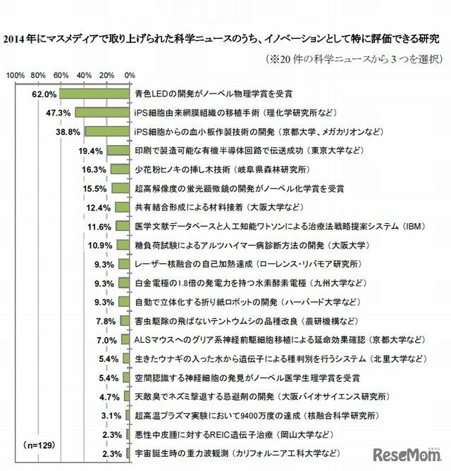 日本の科学研究者が選ぶ、2014年のもっとも革新的な科学ニュースは、「青色LEDの開発がノーベル物理学賞を受賞」が1位となったことが、バイエル薬品とリバネスの「科学イノベーション調査2014」より明らかになった。