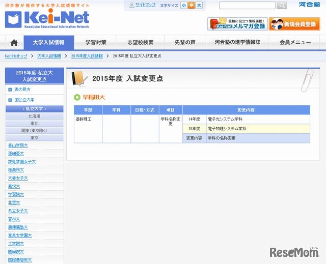 河合塾は12月9日、2015年大学入試情報として、「私立大学・短期大学・大学校の初年度納付金一覧」「新設大学・増設学部・学科一覧」「入試変更点一覧」の最新情報を同塾の入試情報サイト「Kei-Net」に掲載した。