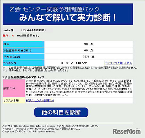 Z会は、「平成27年用センター試験予想問題パック」の発刊にあわせて、自己採点結果の登録で平均点やランキング、科目別アドバイスを確認できる「実力診断サイト」を開設した。